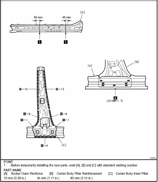 Temporarily install the new parts and measure each part of the new parts in accordance with the body dimension diagram. (See the body dimension diagram) Inspect the fitting of the related parts around the new parts before welding. This affects the appearance of the finish.