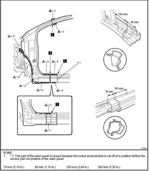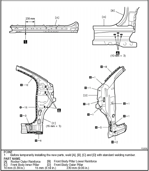 Temporarily install the new parts and measure each part of the new parts in accordance with the body dimension diagram. (See the body dimension diagram) Inspect the fitting of the related parts around the new parts before welding. This affects the appearance of the finish.
