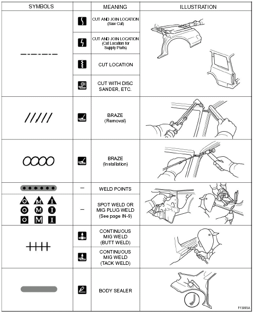 The following symbols are used in the welding diagrams in section BP of this manual to indicate cutting areas and the types of weld required.