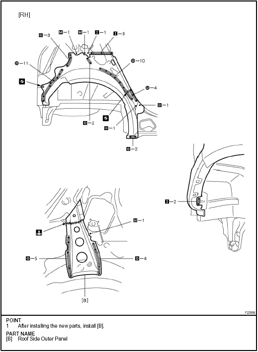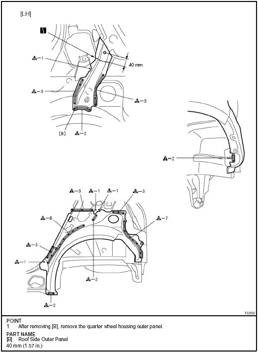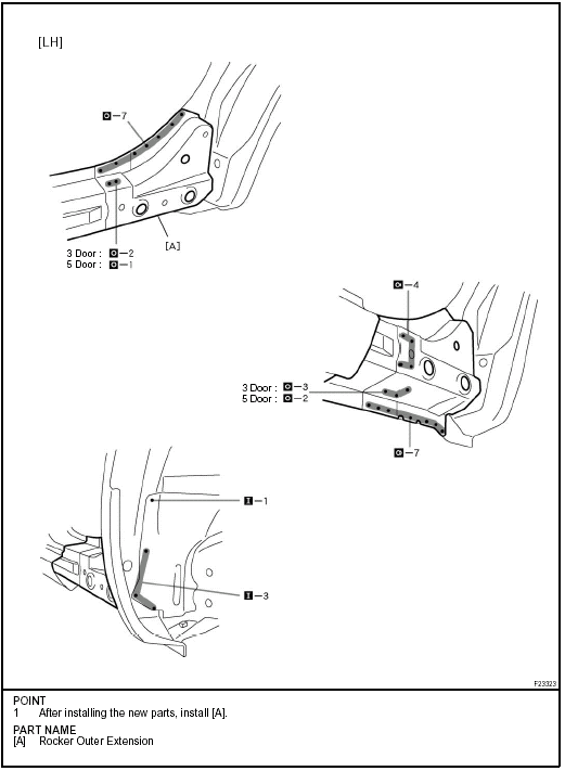Temporarily install the new parts and measure each part of the new parts in accordance with the body dimension diagram. (See the body dimension diagram) Inspect the fitting of the related parts around the new parts before welding. This affects the appearance of the finish.