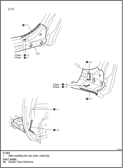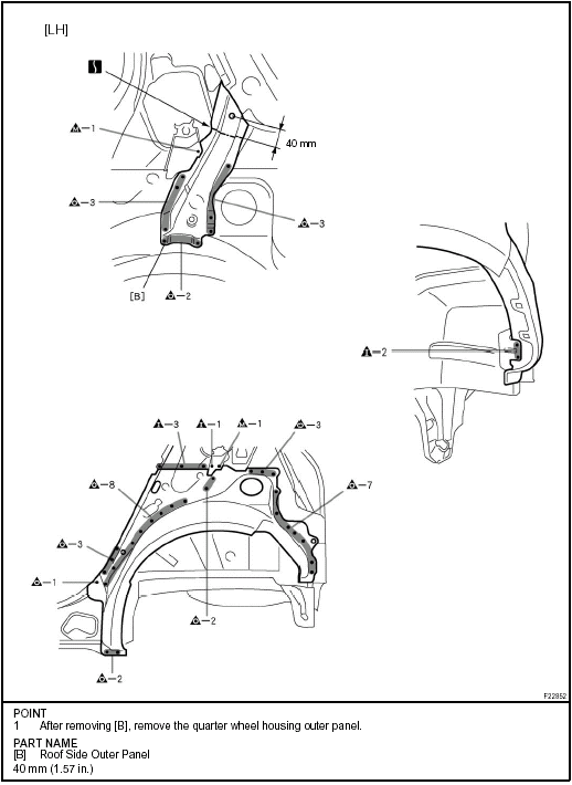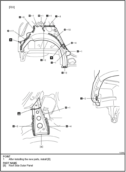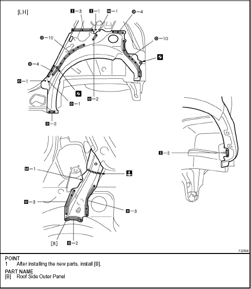 Temporarily install the new parts and measure each part of the new parts in accordance with the body dimension diagram. (See the body dimension diagram) Inspect the fitting of the related parts around the new parts before welding. This affects the appearance of the finish.