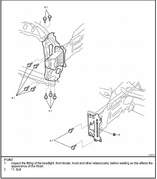 Temporarily install the new parts and measure each part of the new parts in accordance with the body dimension diagram. (See the body dimension diagram) Inspect the fitting of the related parts around the new parts before welding. This affects the appearance of the finish.