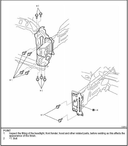 Temporarily install the new parts and measure each part of the new parts in accordance with the body dimension diagram. (See the body dimension diagram) Inspect the fitting of the related parts around the new parts before welding. This affects the appearance of the finish.